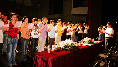 大会的第二项议程是新党员宣誓。由副院长葛朗同志领誓,全校新党员上台集体宣誓,全体党员起立,一同重温了入党誓词。在党旗的辉映之下,整个宣誓过程庄严而又热烈。