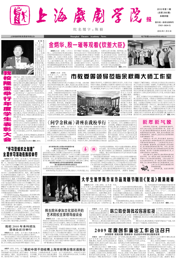 《上海戏剧学院报》2010年第1期(总第206期)已出版,本期四版,本期重点内容有:《我校隆重举行年度学生表彰大会》、《金炳华、殷一璀等观看<钦差大臣>》、《市教委等领导莅临余秋雨大师工作室》、《<问学余秋雨>讲座在我校举行》、《“学习型组织之创建”主题学习活动在我校举行》、《大学生俄罗斯作家作品戏剧节剧目<复活>圆满谢幕》、《韩生院长参加文化部召开的艺术院校主要领导座谈会》等,敬请关注。也可从校园网主页新闻中心内院报专栏点击下载观看。(图文/小河 编辑/雨田)