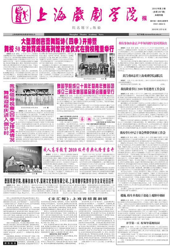 《上海戏剧学院报》2010年第2期已于2010年3月10日出版(总第207期),本期四版,重点内容有:《大型原创芭蕾舞蹈诗<四季>开排暨舞校50年教育成果陈列馆开馆仪式在我校隆重举行》《我校参加由俞正声率领的拥军慰问团演出》《黄昌勇同志任上海戏剧学院副院长》《我校隆重举行2009年度德育工作会议》《我校举行中层干部会暨教学科研工作会》《舞校迎校庆进入倒计时我校领导视察<四季>排演情况》《楼巍、韩生率我校干部赴上戏附中调研》《开学第一天 校领导巡视校园》《舞蹈学院成立十周年暨青年舞蹈团成立三周年舞蹈精品晚会隆重举行》《成人高等教育2010级开学典礼隆重召开》《德国歌德学院、柏林自由大学、保利文化集团有限公司、上海戏剧学院教学合作会议近日召开》《<文汇报>:上戏首招喜剧班》,敬请关注。也可点击“上戏新闻”中“院报”栏目下载观看。(图文/谷晴 编辑/谷晴)