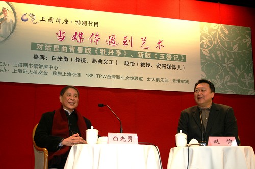 此次活动名为《当媒体遇到艺术,对话昆曲“牡丹亭”、“玉簪记”》,是白先勇先生与台湾前新闻局长、上海交通大学赵怡教授以访谈形式进行的一次讲座。赵怡先生用非常幽默、引导的对话方式,让白先勇娓娓道来,他是如何爱上昆曲,以及大力推动昆曲的动机及使命感。