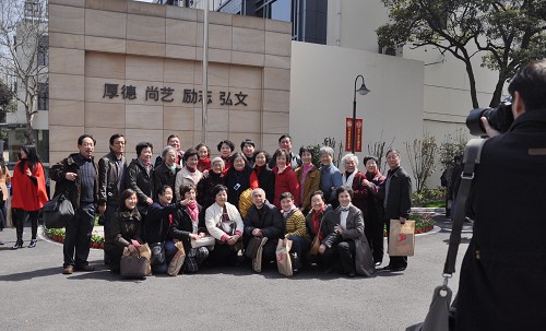 师生校友争相与李慕琳铜像合影