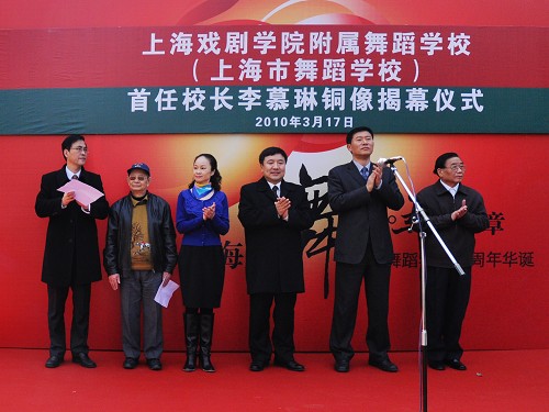 上海戏剧学院院长韩生、上海文广局党委副书记刘建、上海大学教授著名社会学家邓伟志、著名雕塑家王志强、李慕琳老校长的家属代表杨沪生、老教师代表方元、校友代表汪齐凤出席揭幕仪式