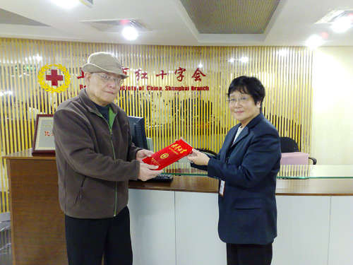 我校离休党支部的42位老同志,共为玉树灾区捐款28300元,冯少唐同志代表大家接受了市红十字会颁发的捐款证书。(图/周鸣 文/子鱼 编辑/子鱼)