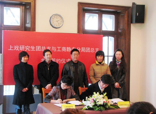 花如霞,芳草吐新;清风拂面,细雨润眉……在莺飞草长的四月天里,我院党委组织部部长邱中岳、学生处副处长徐咏、团委书记陈云、研究生团总支书记李冬梅等与工商静安分局团总支的代表们在佛西楼老干部活动室开展了共建签约仪式,并由上海市工商静安分局团总支书记吴静霞和我院研究生团总支书记李冬梅分别在《上海戏剧学院研究生团总支与上海市工商行政管理局静安分局团总支共建协议》上签字。