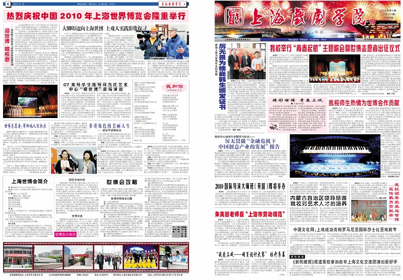 《上海戏剧学院报》2010年第5期已于2010年5月15日出版(总第210期),本期彩版,共四版,本期重点内容有:《厉无畏为楼巍韩生颁发证书》、《我校举行“青春起航”主题歌会暨世博志愿者出征仪式》、《精彩世博 青春上戏》、《我校师生热情为世博会作贡献》、《厉无畏做“金融危机下中国创意产业的发展”报告》、《2010国际导演大师班(英国)即将举办》、《朱美丽老师获“上海市劳动模范”》、《“我爱上戏――网页设计大赛” 拉开序幕》、《内蒙古自治区领导感谢我校对艺术人才的培养》、《我校团委荣获迎世博“宣传教育贡献奖”》、《中国文化网:上戏成功亮相罗马尼亚国际莎士比亚戏剧节》、《《新民晚报》报道我校参加赴非上海文化交流团演出获好评》等,敬请关注。也可从校园网主页新闻中心内院报专栏点击下载观看。(图文/谷晴 编辑/谷晴)