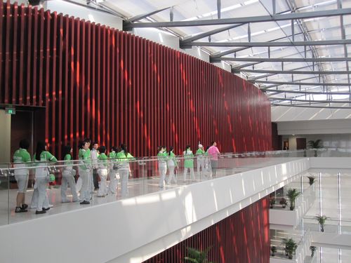 作为对上海戏剧学院世博园区志愿者工作的肯定与奖励,经过陈云老师与世博中心志愿者部的沟通,今天下午15:30,长期带队老师周文斌带领暂时没有岗位的志愿者参观了世博中心。作为世博会安保级别最高的场馆之一,世博中心是基本不对外开放的,一直是最神秘的场馆。世博会结束后,如果同学们以游客的身份再想进入世博中心参观,基本上是不可能的,所以今天下午,同学们都非常重视这次机会,从一楼到七楼,世博中心的神秘面纱被慢慢揭开,红厅、中央大厅、蓝厅(上海厅)、金厅,世博中心的大气、沉稳、典雅和庄重让所有志愿者们为之震撼,在四楼与七楼之间的观景区域,可以看到庆典广场、音乐喷泉、文化中心、卢浦大桥、南浦大桥和浦西的大片区域,第一次从这么好的角度观看世博,同学们都难掩内心的激动之情,纷纷合影留念。一个小时的参观时间结束了,志愿者们有些恋恋不舍,他们开玩笑地说:“又要去过地下生活了。”