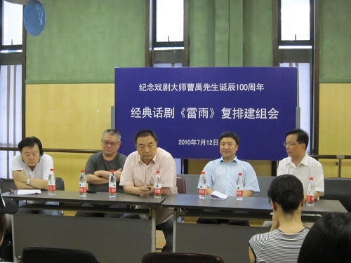 今年是曹禺先生诞生一百周年,为隆重纪念曹禺先生,我校与上海话剧艺术中心合作,对2007版话剧《雷雨》进行复排。7月12日下午1点,经典话剧《雷雨》复排建组会在我校一号形体房举行。上海话剧艺术中心总经理杨绍林,我校院长韩生、教授张仲年、演艺中心负责人王履玮、导演王延松,出席了建组会。