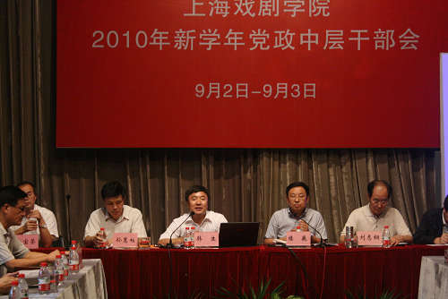 下午,院长韩生代表学校做了题为《落实规划・改革创新・追求卓越・服务社会》的主题报告,对新学年教学行政的主要工作任务进行了部署。在报告中,韩生院长把新学年的工作任务归纳为十二项内容,即:招生计划制定和制度改革,学分制改革,国际交流工作,学科布局优化与一级学科博士点申报,导师工作室制度试点,重点剧目创作准备,校区拓展工作,预算工作,设备、产业及剧场管理工作,学生就业及心理辅导,六十五周年校庆,大学制度文化建设等。