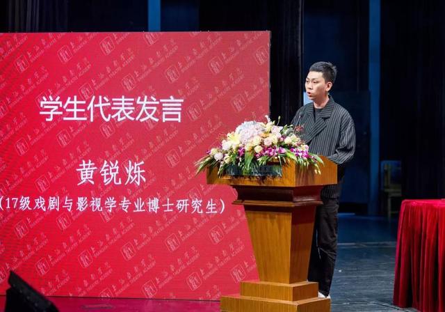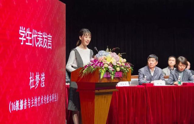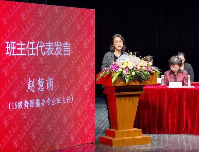 在代表发言环节,来自16级播音与主持艺术专业的本科生代表杜梦滢同学和来自研究生部17级戏剧与影视学专业博士研究生黄锐烁同学依次上台发言。他们表达了对学校的感激,对老师与同学的感谢,还从自身的经历出发,说出了自己的艺术追求与理想,分享在学习生活中的感悟,表示将承担起对艺术的责任,继续在未来的艺术道路中努力,成为至善至美的上戏人。15级舞蹈编导专业班主任赵慧萌老师作为优秀班主任代表上台发言,她将班主任的责任化为思想的引导者、学习的指导者、信赖的好朋友三个方面,表达了自己对师生关系的认识,并举例分享自己的教育工作方法。赵慧萌老师也谦虚地表示班主任工作仍需不断的学习与进步,保持“凭良心做事,尽全力做好”的工作态度,为更多上戏学子贡献自己的力量,让学校优秀的师资更好地教育影响到学生的各个方面。