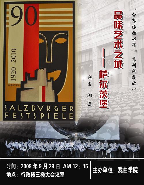 9月29日12:15――13:15 ,戏曲学院首期推出的“分享你的心得”系列讲座之一,是由戏曲学院戏曲导演专业青年讲师郑稳主讲的“品味艺术之城――萨尔斯堡”。