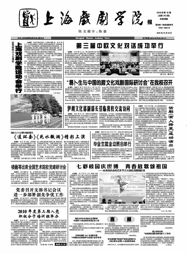 《上海戏剧学院报》2010年第10期(总第215期)已于2010年10月30日出版,本期四版。重点内容有:《第三届中欧文化对话成功举行》、《上海戏剧学院运动会举行》、《伊朗文化部副部长莅临我校交流访问》、《<连环套><死水微澜>精彩上演》、《七彩校园庆世博 青春放歌颂祖国――由我校承办的艺术节天天演活动圆满结束》等,敬请关注。也可从校园网主页新闻中心内院报专栏点击下载观看。(图文/戎戎 编辑/戎戎)