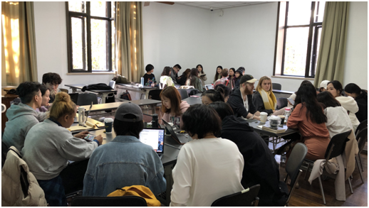 不同往年,今年的课程又有了创新,三位来自哥大的同学将参与课程的同学们划分为三个小组,并制定了合理的课程安排,每节课的开始都带领全体同学以集体的形式朗读优秀的国外英文剧本或欣赏戏剧片段,紧接着则分为三个小组,分别有三位各大同学轮流组织,对中国学生的英文千字剧作品进行组内点评和讨论,创作氛围火热,每一位同学都享受其中。