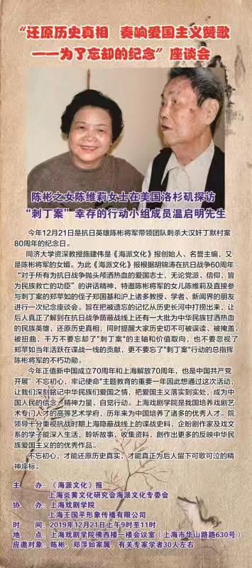 2019年12月21日,抗日英雄陈彬将军带领团队刺杀大汉奸丁默村案(以下简称“刺丁案”)80周年之际,上海炎黄文化研究会海派文化专委会、《海派文化》报在上海戏剧学院,举办《还原历史真相,奏响爱国主义赞歌——为了忘却的纪念》座谈会,特邀陈彬将军的女儿陈维莉出席,沪上教授、学者和媒体人士等30余人齐聚一堂,深情缅怀抗日将领陈彬的传奇人生。