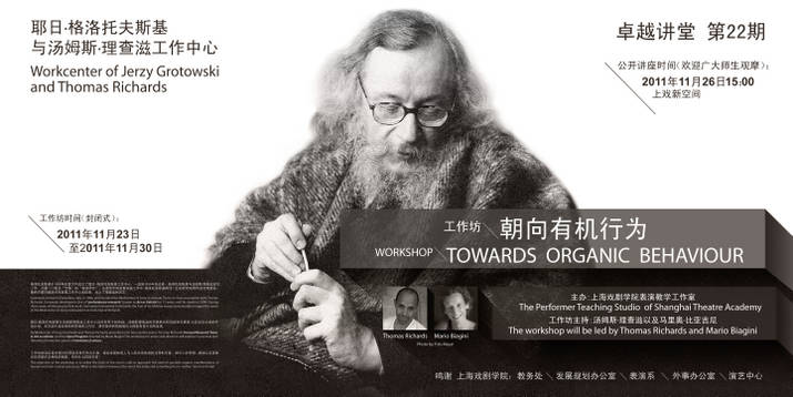 耶日·格洛托夫斯基与汤姆斯·理查兹工作中心来沪讲学是上戏表演教学工作室成立后的第一个项目,通过此次学术交流,希望增进对格洛托夫斯基理论和实践的直观认识,促进上海戏剧学院与工作中心的交流与合作。也是借此向伟大的戏剧先驱耶日•格洛托夫斯基表达我们的敬意!(文、图:表演系 编辑:榕树)