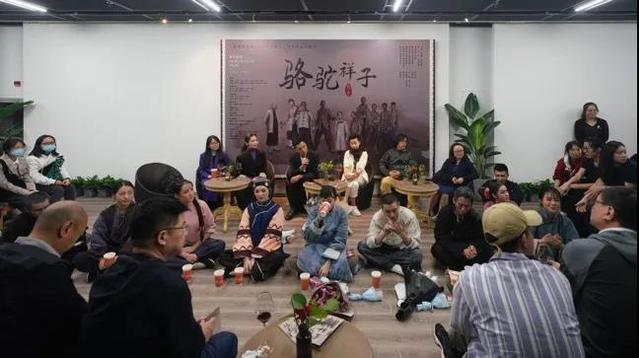“演后谈”由演艺中心主任伊天夫、《骆驼祥子》的制作人佟姗珊主持,导演郭洪波、舞美设计指导老师姜明会、灯光设计指导老师沈倩、服装造型设计指导老师冯燕容、多媒体设计指导老师陈如华等师生主创人员参加。本次演出的《骆驼祥子》,导演将老舍的同名小说改编成了一个追求独立自由的梦,想要更多地与演员和观众探讨一个关于理想和现实的问题,这两者到底该如何去平衡,在现实中是应该随波逐流还是勇敢面对现实。现场来自研究生部、戏剧影视文学系、艺术管理等专业的同学,以及其他观众积极参与其中,观众针对原著与舞台表现的不同进行了提问:“老马的那一幕为什么没有虎妞在场?”导演回答道“我认为传统《骆驼祥子》的表现应该叫《虎妞》,在我导演的这部作品中我将祥子的戏份增加,更加体现车夫的内心情感和底层人民的生活”,另外一位艺术管理专业的同学谈到“看完这部戏后认为自己非常渺小,舞台上仅用几块景片就创造出多个不同的空间效果,你们就像是魔术师一样”,就这一话题舞美设计指导老师姜明会进行了交流“主要配合导演的总体构思,舞台上运用了多媒体与移动景片的相结合,制造出多个不同的空间场景”,还有其他观众针对演员表演、灯光现场处理等提出了问题,主创人员现场做出即时回答与交流,尤其对于导演使用电影蒙太奇手段在舞台上的表现进行了热烈的讨论,现场气氛活跃,观众积极参与,即时与主创团队进行艺术交流与思想碰撞。