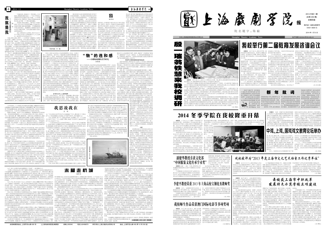 《上海戏剧学院报》2014年第1期(总第255期)已于2014年1月5日出版,本期共四版。重点内容有:《殷一璀翁铁慧来我校调研》、《我校举行第二届教育发展咨询会议》、《2014冬季学院在我校隆重开幕》、《中戏、上戏、国戏戏文教育论坛举办》等,本期第三版还选登了校园戏剧指导教师研修班学员心得,敬请关注,也可点击下载阅读。(文、图、编辑:榕树)