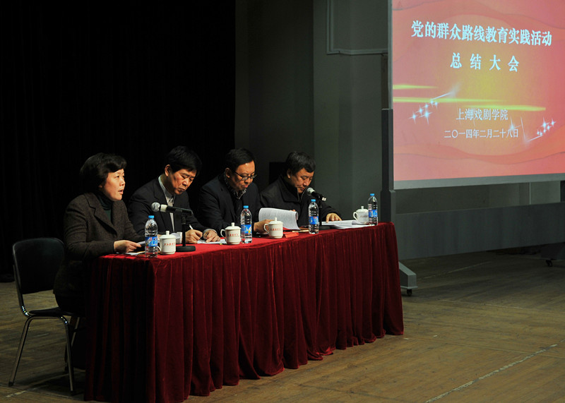 2014年2月28日下午,我校在新空间召开了“上海戏剧学校党的群众路线教育实践活动总结会”,我校党委书记楼巍、院长韩生、党委副书记胡敏,市教卫工作党委第一督导组组长董金平、副组长陈荣武以及其他督导组成员、学校全体中层干部、老同志代表、民主党派代表、教职工代表等出席会议。会议由院长韩生主持。