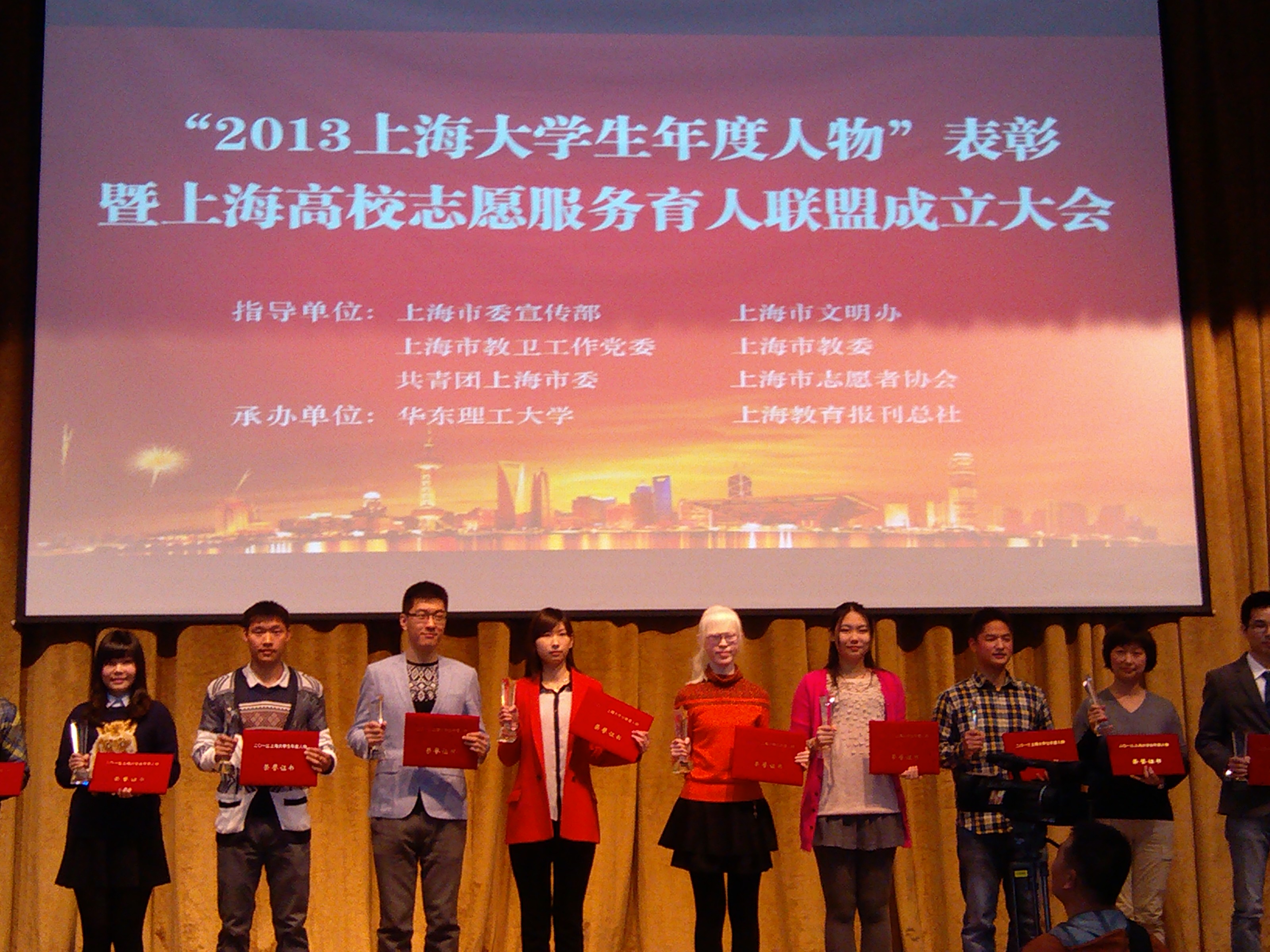 上海大学生年度人物评选活动由市委宣传部、市教卫工作党委、市教委、团市委联合举办,上海教育报刊总社主办、东方教育时报承办,已连续举办四届。2013上海大学生年度人物评选共收到来自全上海42所高校申报的68份材料。组委会组成初评委从68份材料中推荐出20位候选人,然后通过网络投票、学校投票以及专家评选,选出10位大学生年度人物、十位大学生年度人物提名奖。