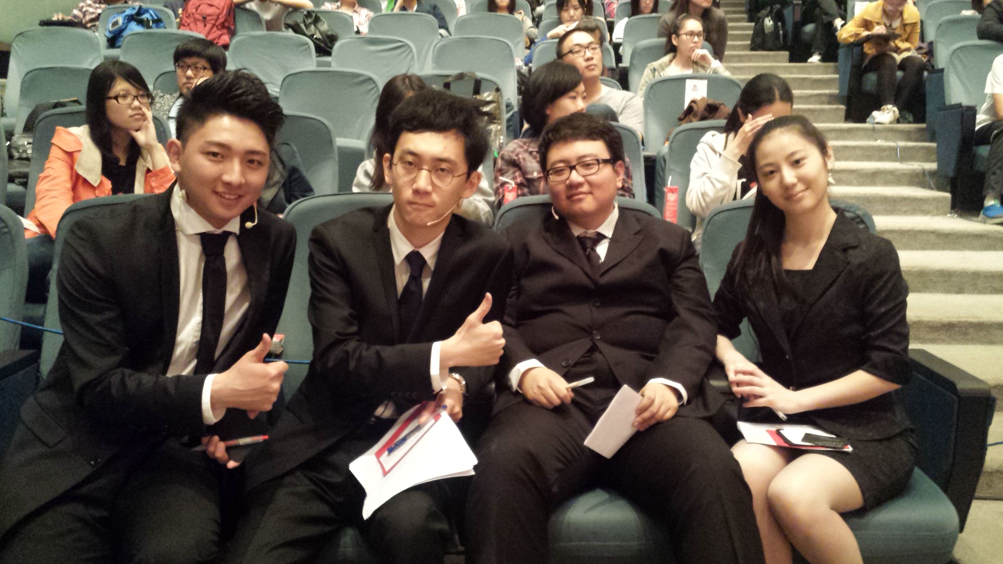图为我校辩论队决赛选手(从左依次为一辩、四辩、二辩与三辩)