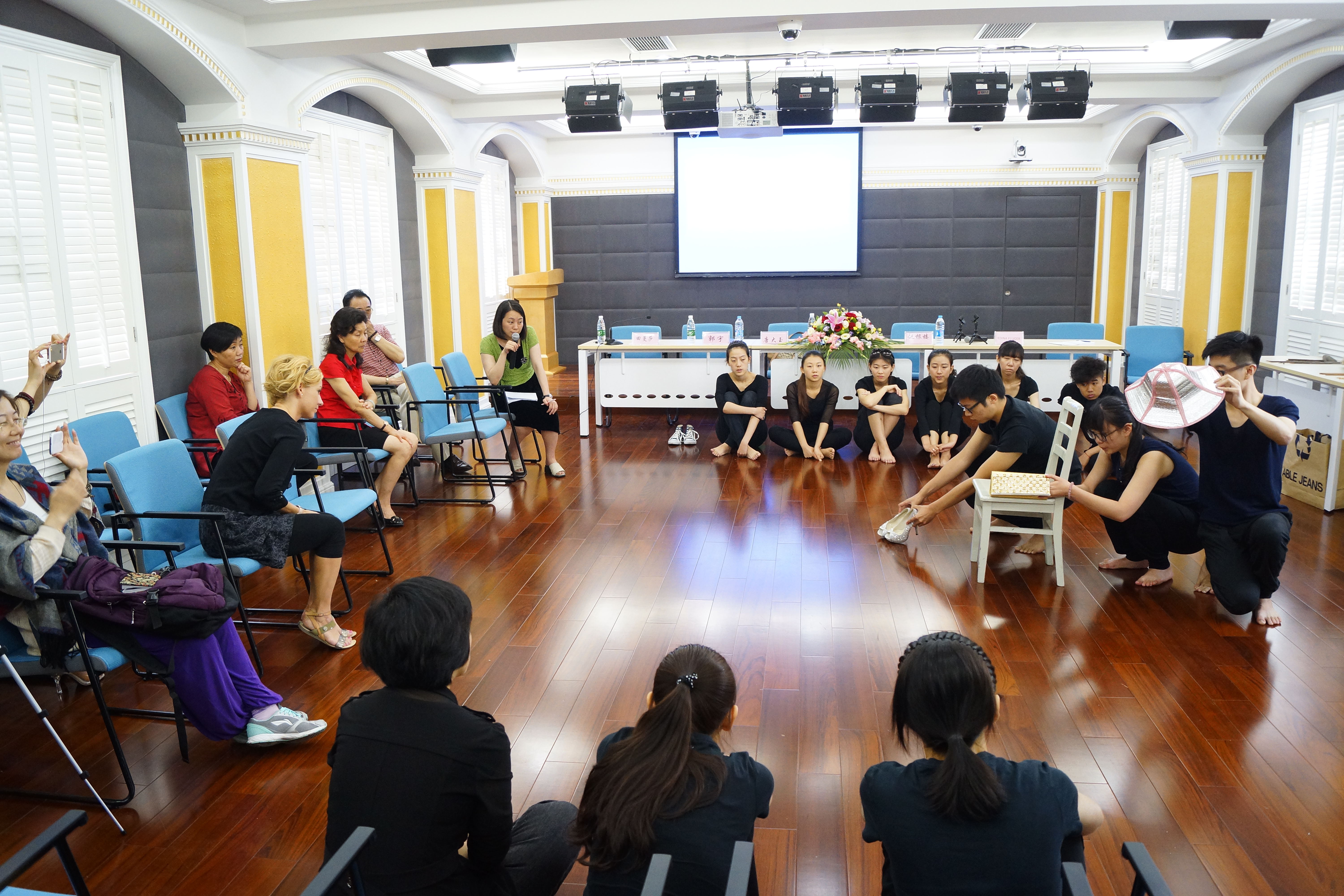 之后是匈牙利外教公开示范课,Edina围绕物体木偶这一概念,让同学们对身边的物品通过合理的想象将物品拟人化生动化,在外教的引导下同学们运用帽子和鞋、扇子等物品形象生动的表演出不同的人物角色,在场的领导、师生也被同学们的想象力和表现力所吸引。