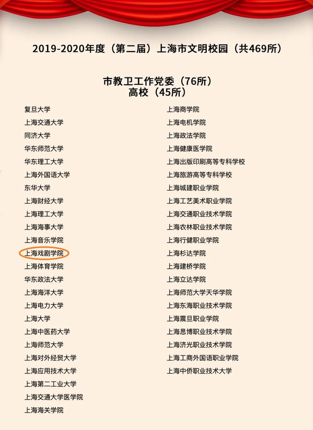 市文明办近日公布沪文明城区、文明行业、文明单位、文明校园名单。上海戏剧学院等469所学校为2019-2020年度(第二届)上海市文明校园。上海戏剧学院附属舞蹈学校、上海戏剧学院附属戏曲学校均名列其中。