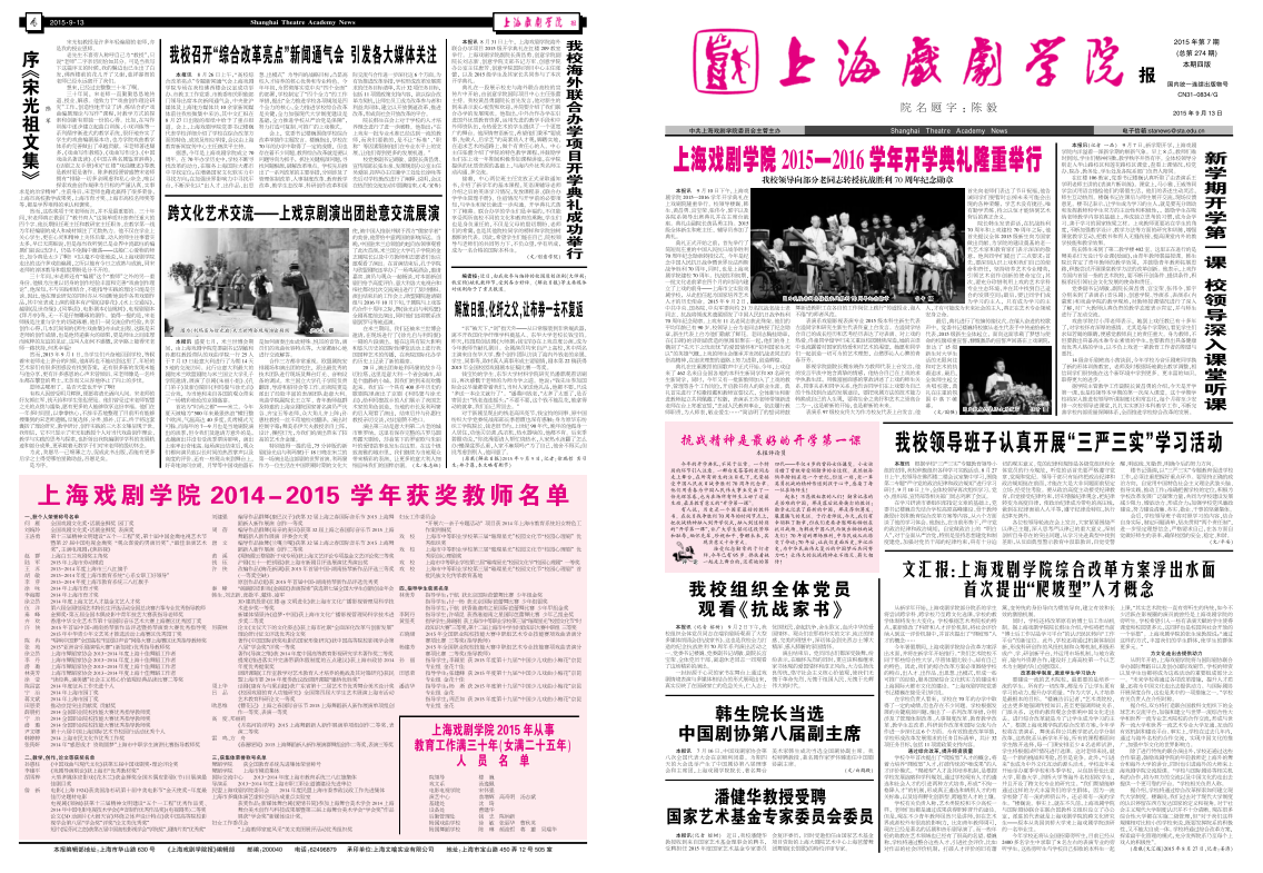 《上海戏剧学院报》2015年第7期(总第274期)已于2015年9月13日出版,本期套红,共四版。重点内容有:《上海戏剧学院2015—2016学年开学典礼隆重举行》、《新学期开学第一课 校领导深入课堂听课》、《我校组织全体党员观看<抗战家书>》、《韩生院长当选中国剧协第八届副主席》等。敬请关注,也可点击下载阅读。(文、图、编辑:榕树)