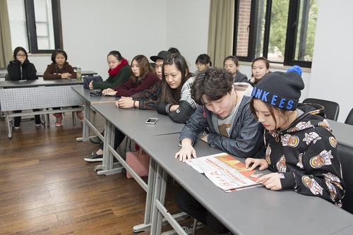 图为学生记者正在听取党的十八届五中全会精神的传达