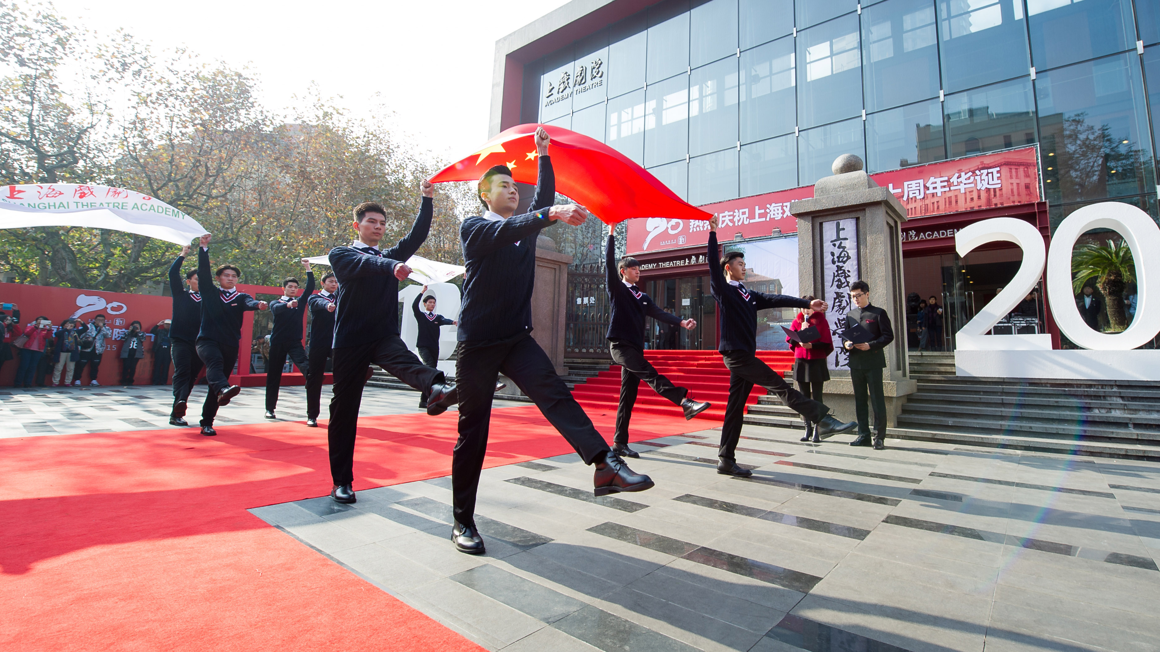 在慷慨激昂的国歌声中,庆典拉开了帷幕。由在校本科生、研究生代表、少数民族学生代表、毕业生代表、留学生代表及进修生代表组成的旗手方队,将手中的五星红旗与上海戏剧学院校旗冉冉升起。