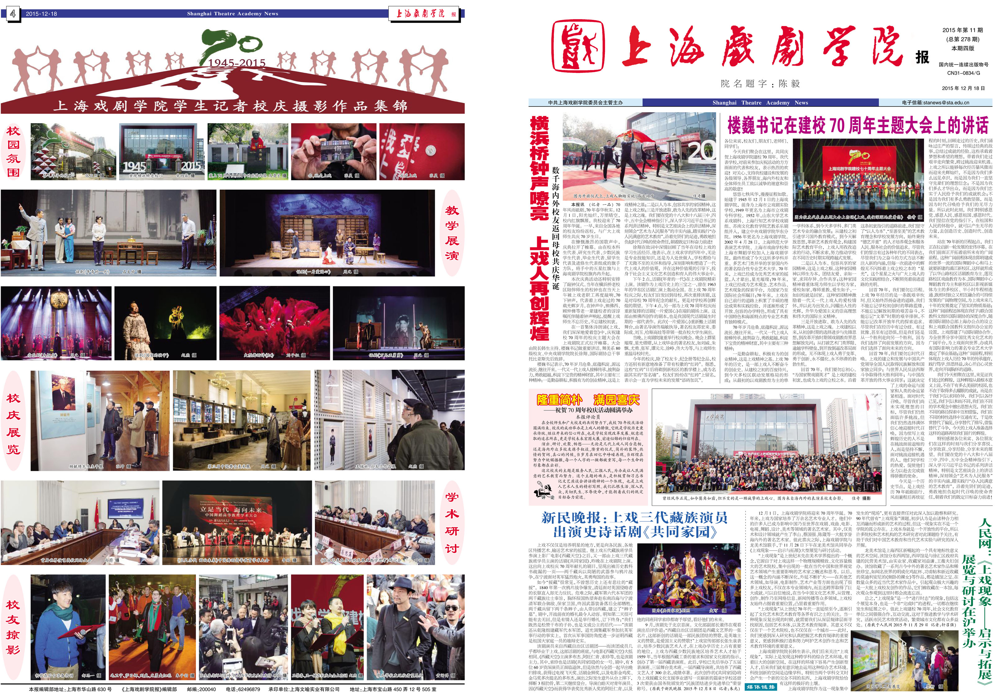 《上海戏剧学院报》2015年第11期(总第278期)已于2015年12月18日出版,本期一、四版为彩版,共四版。重点内容有:《横浜桥钟声嘹亮 ,上戏人再创辉煌》、《楼巍书记在建校70周年主题大会上的讲话》、《新民晚报:上戏三代藏族演员出演史诗话剧<共同家园>》、《人民网:<上戏现象——启示与拓展>展览与研讨在沪举办》等。敬请关注,也可点击下载阅读。