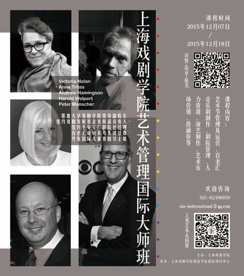 本大师班由上海戏剧学院主办,上戏创意学院国际项目中心承办,集结上海戏剧学院所聘请的海外顶级专业院校教授以及业界领军人物,面向全国招生,旨在培养高级艺术管理、剧院管理、演艺制作人才,使国内和国际院团能够在同一平台上实现面对面的交流,拓宽学员的视野。