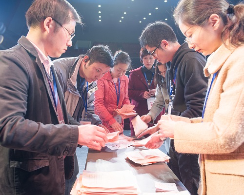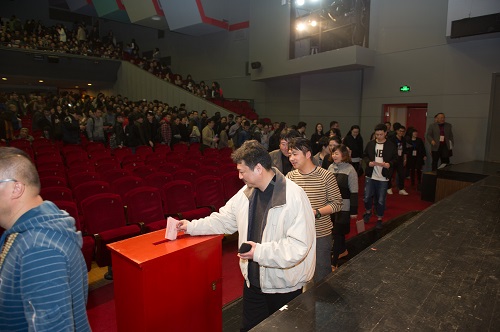会上,胡敏副书记发言,并宣读投票人数,介绍投票流程;随后,选民从前排开始依次上前,在票箱前投上了自己庄严的一票。纪监处钱平安处长担任监票,并在全体师生面前开箱验票。经统计,大会会场投票人数1053人,委托投票195人,剔除15张废票,有效票数1233张。最终,王苏以779张得票数,当选为本届代表,得票占比62.42%。