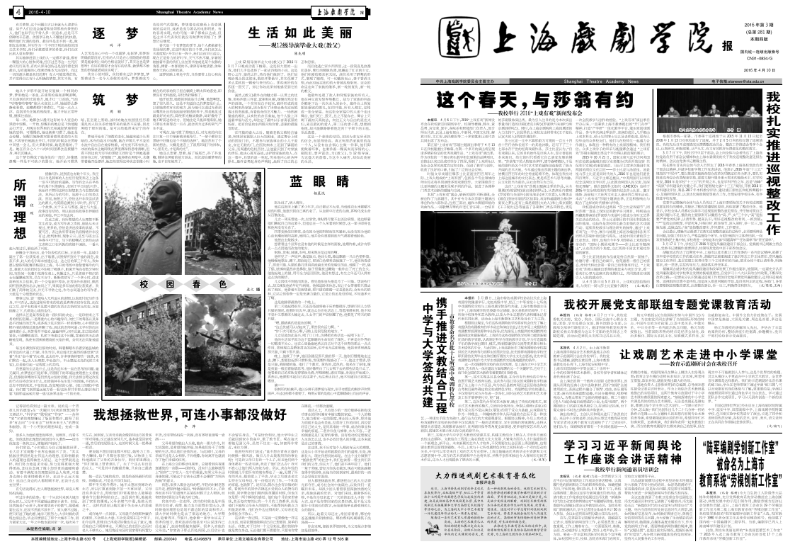 《上海戏剧学院报》2016年第3期(总第281期)已于2016年4月10日出版,本期共四版。重点内容有:《这个春天,与莎翁有约——我校举行2016“上戏有戏”新闻发布会》、《我校扎实推进巡视整改工作》、《中学与大学签约共建 携手推进文教结合工程——市教委命名首批十七所高中戏剧特色学校》、《我校开展党支部联组专题党课教育活动》、《让戏剧艺术走进中小学课堂——教育示范剧研讨会在我校召开》等。敬请关注,也可点击下载阅读。(文、图、编辑:榕树)