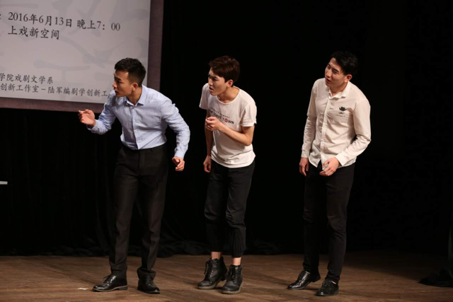 2016年的端午节三天假期,新空间的排练紧锣密鼓进行着。参与陆军教授“百·千·万字剧”编剧工作坊课程的学生,在陆军教授、黄溪老师的带领下,热情又紧张地投入到最后的走台中。