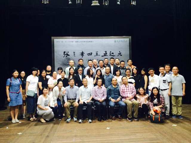 演出结束后,师生合影留念。陆军教授做了总结,他说:“今晚,很可能是新时期以来上戏演出史上最简陋、最仓促、最受限制的一次表达。说简陋是因为,整个演出只有几张桌椅与一些替代道具,最大的经费投入是后面那块宣传板。说仓促是因为,5月26日第一次当堂作业《借钱》;6月2日第二次当堂作业《最后一片韭菜叶》,从同学们走进教室写下第一个字到今天演出,总共只有十来天时间。说最受限制是因为,所有作品都是命题创作,限定的时间,限定的人物,限定的事件,限定的形式。所有这些,我想表达的意思,‘百·千·万字剧’编剧工作坊成果展演是一次纯粹的教学交流,是编剧教学模式的探索性改革,目的是让同学们看到自己被搬上舞台后的习作,产生或如坐针毡、或若有所思、或若有所悟的教学效果,从而更好地理解自己的作品、完善自己的作品。我们用这样的方式训练学生,也是完善青年编剧培养与成长机制的一次有益尝试。”
