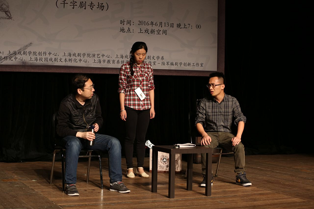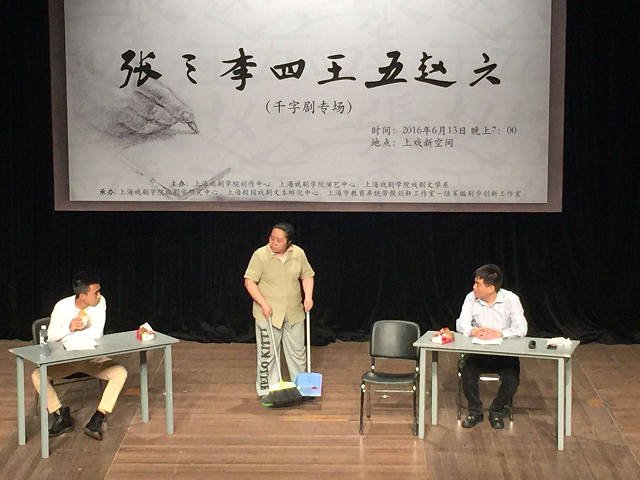 6月13日晚7:00,由上海戏剧学院创作中心、演艺中心、戏文系主办,上海戏剧学院编剧学研究中心、上海校园戏剧文本孵化中心、上海市教育系统劳模创新工作室-陆军编剧学创新工作室承办的2016“百·千·万字剧”编剧工作坊成果展示——《张三李四王五赵六》千字剧专场演出在上戏新空间顺利举行。校党委副书记胡敏,副院长宫宝荣、张伟令、郭宇,校工会专职副主席王苏,校招生与毕业生就业工作办公室副主任尹永华,戏文系主持工作副主任刘庆、系党支部书记沈亮,校信息办副主任陈永东等领导与老师观看了演出。