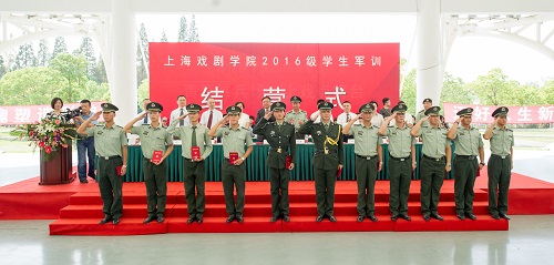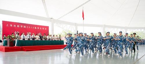 结营式在升国旗、奏唱国歌的仪式中正式开始。党委书记楼巍在东方绿舟副主任、上海市国防教育中心主任吉峰教官的陪同下检阅了16级新生受训连队。在分列式行进过程中,由中国人民解放军三军仪仗队的三名教官组成的军旗护旗组护卫着八一军旗,走在最前面,接着是四名新生代表高高举起上海戏剧学院校旗紧随其后,10个受阅方阵依次通过主席台,接受了校领导和院系领导老师们的检阅。