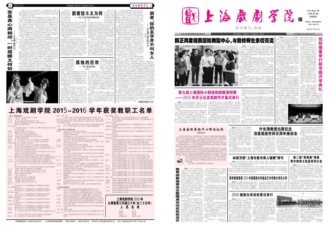《上海戏剧学院报》2016年第7期(总第285期)已于2016年9月20日出版,本期套红,共四版。重点内容有:《韩正两度视察国际舞蹈中心,与我校师生亲切交流》、《第九届上海国际小剧场戏剧展演特辑——2016年莎士比亚戏剧节开幕式举行》、《我校隆重举行新学期开学典礼》、《教育部教指委会议暨圆桌论坛在我校召开》等。敬请关注,也可点击下载阅读。(文、图、编辑:榕树)