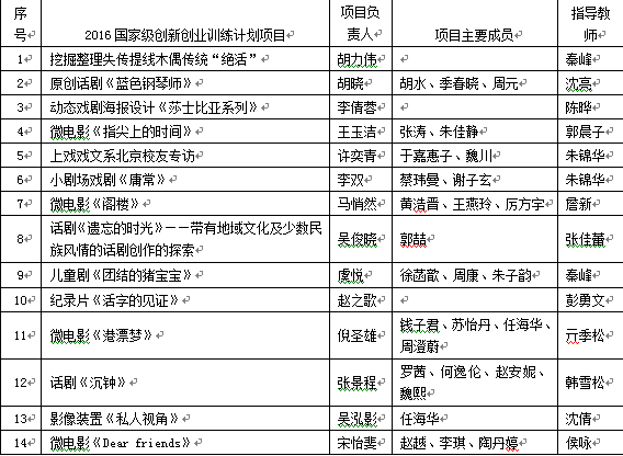日前,教育部发布了《关于公布2016年国家级大学生创新创业训练计划项目名单的通知》(教高司函[2016]45号),上海戏剧学院有14项大学生创新创业训练计划项目获得立项。