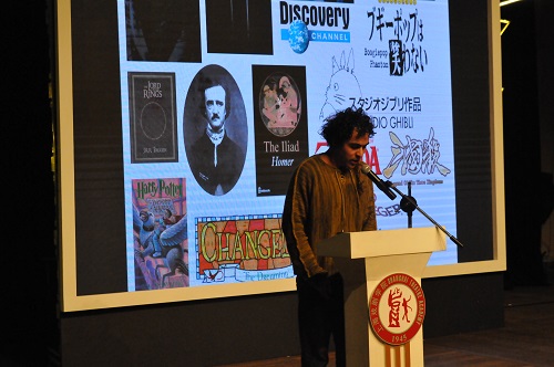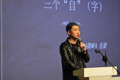 来自戏文系的13级戏剧影视文学专业的侯雪菲同学首先开讲,她与大家分享了自己报考上戏的经历,饱含深情地讲述了自己求学路上的艰辛付出,讲到动情处不禁哽咽,她的经历引起在场所有同学的共鸣,让人心生感怀,眼泪盈眶;第二位演讲者是我校2016级跨文化交流在读硕士余晖。来自巴西的他,用幽默轻松的成长故事,向大家呈现了他的生活,以及为何要学习艺术。他希望不仅做个“巴西人”,更能够成为“世界公民”,更多地去领悟世界文化;最后一位讲演者是15级戏剧影视导演在读硕士毛梁同学,他用十分诙谐的语言讲述了自己在就读本科时的学习生活,以及他在2008年从我校毕业后,前往北京成为北漂的辛酸经历。他从“自信、自律、自省”三个方面告诉大家为人处世的道理。
