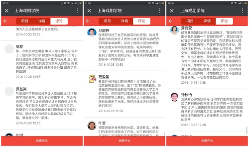 同学们将赞许和掌声送给了三位演讲者,有的听众更是与三位同学进行了互动和交流。活动结束后,同学们用手机在“青春上戏”的微信服务号上进行了自主考勤,并发表了自己的观后感,从一条条发自内心的评价中我们可以看到,聆听学生讲堂是一种精神的洗礼,是朋辈教育最为有效的方式之一。