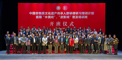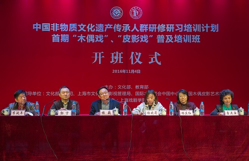 2016年11月4日,由文化部、教育部主办,上海戏剧学院承办的中国非物质文化遗产传承人群研修研习培训计划首届“木偶戏”、“皮影戏”普及培训班在上海戏剧学院莲花路校区隆重举行开班仪式。出席本次开班仪式的领导和专家有:上海戏剧学院党委书记楼巍,文化部非遗司管理处副处长张晓莉,上海市文化广播影视管理局非遗处处长杨庆红,国际木偶联会中国中心主席、中国木偶皮影艺术学会会长李延年以及国际木偶联会亚太委员会主席、中国木偶皮影艺术学会秘书长唐大玉。开班仪式由上海戏剧学院副院长郭宇主持,并对本次培训计划做了详细的情况介绍。参与首期普及培训的学员从全国各木偶皮影艺术院团报名人员中精心挑选出82名从业者。此次研修研习计划生源广,师资力量雄厚,聘请国内、国际活跃在一线的木偶皮影艺术专家授课,旨在培养一批木偶皮影艺术的复合型、实践型高端人才。