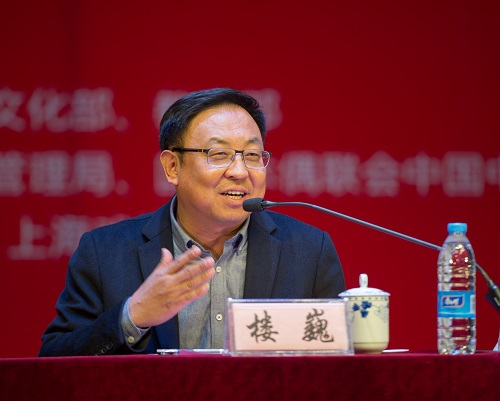 上海戏剧学院党委书记楼巍为此次开班致辞。楼书记代表上海戏剧学院对本次研修研习计划的开展表示热烈祝贺,并对教师和学员的到来表示欢迎。他指出:文化部、教育部相当重视非物质文化遗产的传承与保护,非常感谢国家为非遗传承者们提供此次珍贵的学习机会。上海戏剧学院作为承办方,制定了详细周密的教学计划,精心营造了专业、温暖的培训环境和学术氛围。希望所有的学员以及上戏的学子们能紧握住难得的机会,努力学习专业知识,用心研究,为非物质文化遗产的传承与保护出一份力,同时也祝大家在参加培训的一个月里生活和学习愉快并取得丰富收获。楼书记对此次培训计划表示了热切的期望,他在讲话中强调:“当我们为面向未来的时代弄潮儿猛烈喝彩的时候,千万不要忘记为守护、传承历史遗产的勇士们加油,因为是他们让我们向前行进的时候知道了初心和来路!”
