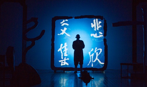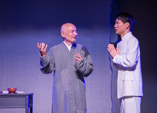 这出戏讲述了弘一大师从战乱年代闭关到圆寂的事迹,并且采用了经典的故事中的故事来演绎,脉络清晰,轻重节奏如点水,粗略回顾整场戏,已生再看之心。“整洁”一词也许可以概括整部戏的风格,一如游本昌先生说,这是一场安静的戏。简单却禅意浓厚的舞台布置,配合黄、红、蓝、三色单色灯光的使用,不仅将场景具象,更使观众更加容易的进入氛围当中。相反,道具的简单更将禅意抽象出来,简化为一左一右两个符号,最后竟也大有深意。