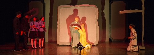 弘一大师不仅是在写字,而且是在以字传法。舞台台唇中央也有一盏灯,它的光束多次穿透半透明的屏风,照出各种各样的正在抄写经书的弘一大师。编剧甚至在弘一大师与一群戏剧社团的学生的一段小事里特地借妙莲法师之口说出了大师字的变换特点。弘一大师不仅第一个提出了戏剧,也发扬戏剧,滋润那一代的年轻人。“但是啊——用文艺改变世界的力量是有限的,充满了无可奈何,这个时代,艺术始终是寄托幻想的载体。”可说着消极的话的弘一大师,可从别人始终否认自己消极的弘一大师,用像那时教导方远“经书要好好抄”的语气说这话时,你丝毫不感到绝望,甚至有一股越来越近的暖流,隔空潺潺流来。山川草木皆是情。