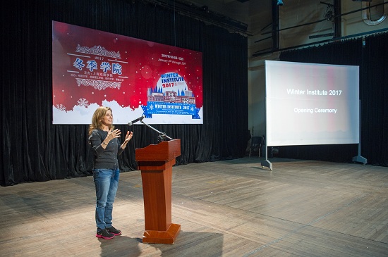 来自麻省理工学院的康开丽(Claire Conceison)教授代表授课教师发言。康开丽教授25年前曾在上戏读书,中文非常流利。她用双语建议大家一定要好好利用冬季学院这个难得的机会,首先要玩得开心,交到朋友,其次要打破现有的小圈子,多探新试奇,少看手机电脑,最后要从冬季学院获得比开心和友谊更多一点的东西。