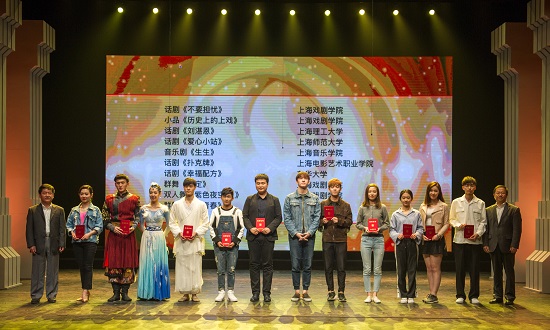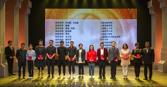 图为戏剧类获奖学生接受表彰