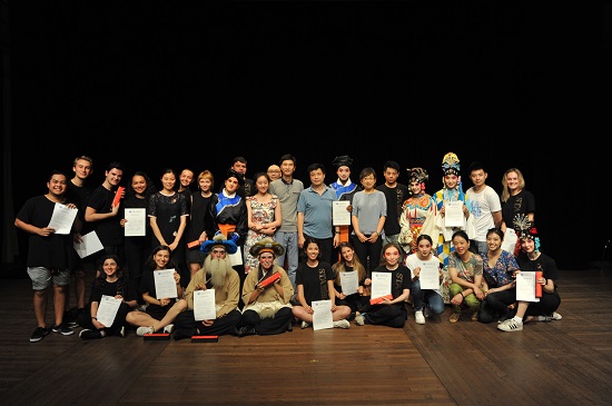 本次暑期班为期21天。在短短的时间里,留学生们不但要学习文化课、汉语课,还要掌握中国戏曲的台步、身段、水袖、刀枪等技巧,并且学习京剧片段的演唱。课业之余,学校还组织学生游玩朱家角水乡,穿梭上海石库门,观摩音乐会、杂技演出等丰富多彩的活动,让学生多角度体验中国文化的精髓。留学生积极参与、热情高涨。7月6日周四下午,可爱的留学生们在上戏新空间全方位展示了他们的学习成果,包括新编京剧《朱莉小姐》、《孔门弟子》的片段,以及传统剧目《秋江》的片段演出。虽然只有短短3周时间,但是留学生们的演出有模有样,唱念做打都表现不俗。汇报结束后,孙惠柱教授向学员们致辞祝贺,并颁发了结业证书。
