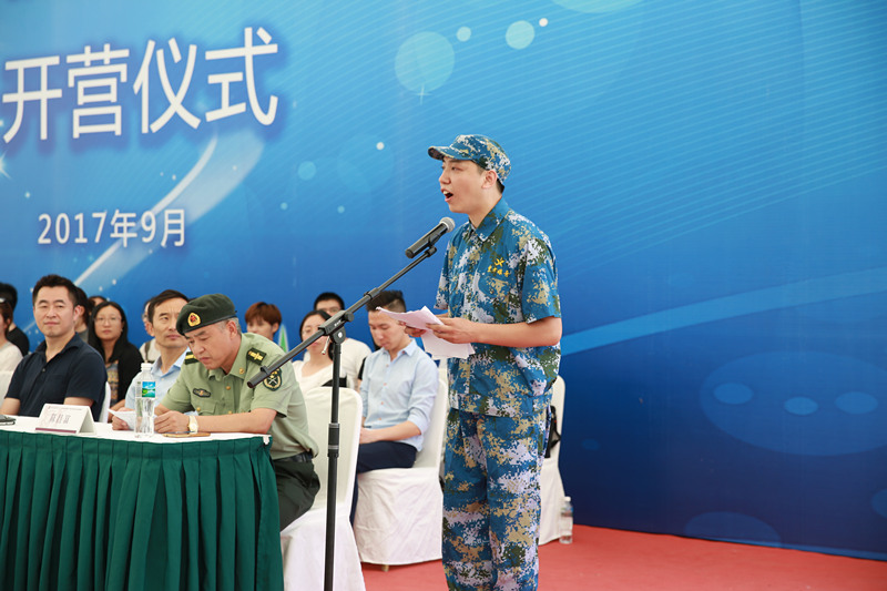之后,戏曲学院戏曲导演专业2017级新生孙照年代表全体参训学生发言,他说入校三天已经感受到来自学校和身边同学的温馨,他希望能和在场的同学一起在军训中做到自强、自律、自信、自立,服从指挥,严格训练,增强身体素质和意志品质,在今后的学习道路上能够始终发扬军人作风,谱写新上戏人的荣耀。