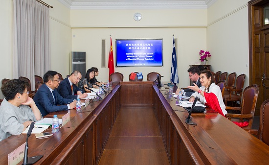 在此次会晤中,上海戏剧学院楼巍书记首先代表学院对来访的部长和希腊驻上海总领事馆总领事表示欢迎,希望通过此次部长的访问,可以增加两国人民及文化艺术之间的交流。古希腊戏剧对西方戏剧有着深远的影响,当代戏剧的发展依然不断从古希腊戏剧中汲取着灵感。我校建立希腊戏剧研究中心,希望以此为平台,在未来加强与希腊艺术院校和艺术家的合作,更好地推动国内对于古希腊戏剧和希腊现当代戏剧的研究。利蒂亚·科尼奥尔部长回顾了之前在上海戏剧学院执教的经历,上戏的师生给她留下了深刻而美好的印象。她同时谈到了自己对于中国戏曲的理解,中国和希腊都有着悠久的戏剧艺术传统,“以古老的戏剧艺术为突破点,我们可以进行跨越时间和地域的艺术实践和交流”,希望未来中希两国的艺术家可以通过学校之间的交流平台,进一步加强科研、文化之间的合作,她非常乐意为这样的合作交流提供资源。