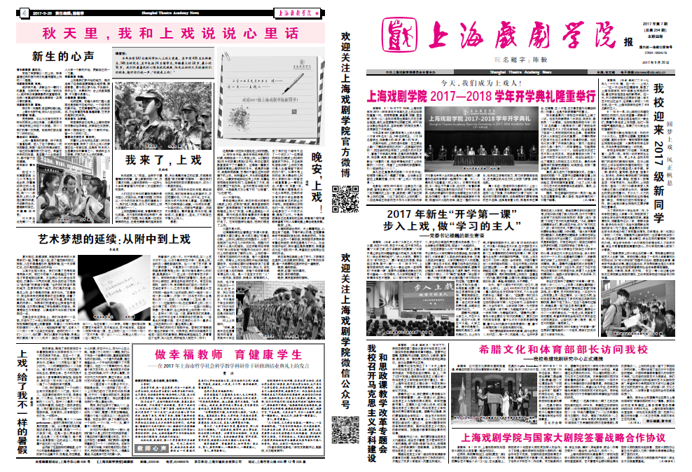 《上海戏剧学院报》2017年第7期(总第294期)已于2017年9月20日出版,本期套红,共四版。重点内容有:《今天,我们成为上戏人!上海戏剧学院2017—2018学年开学典礼隆重举行》《圆梦上戏 风正帆悬 我校迎来2017级新同学》《2017年新生“开学第一课” 步入上戏,做“学习的主人”——党委书记楼巍的新生寄语》《我校召开马克思主义学科建设和思政课教学改革专题会》等。敬请关注,也可点击下载阅读。(文、图、编辑:榕树)